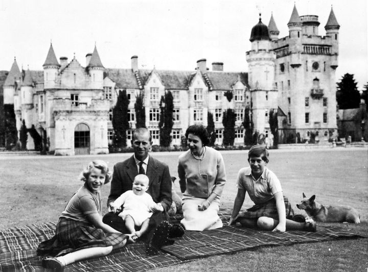 スコットランドのバルモラル城外での家族ピクニック中の1枚。エリザベス女王&フィリップ殿下と、チャールズ国王にアン王女、生まれたばかりのアンドルー、愛犬たちと共にピクニックシートの上でパチリ。
