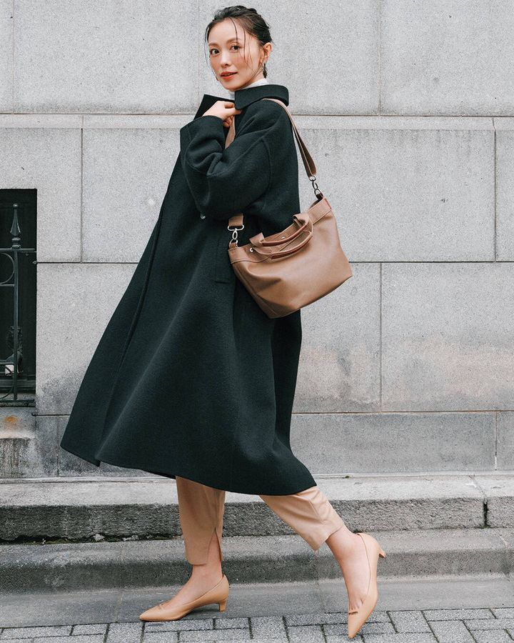バッグ(ミニ)¥12, 100(ウイトート)コート¥107,800(プルミエ アロンディスモン/プルミエ アロンディスモン ニュウマン新宿)パンツ¥33,000(シーニュ)パンプス¥59,400(ペリーコ/アマン)ピアス¥19,800(ワンエーアールバイウノアエレ/ウノアエレ ジャパン)タートルトップス/スタイリスト私物