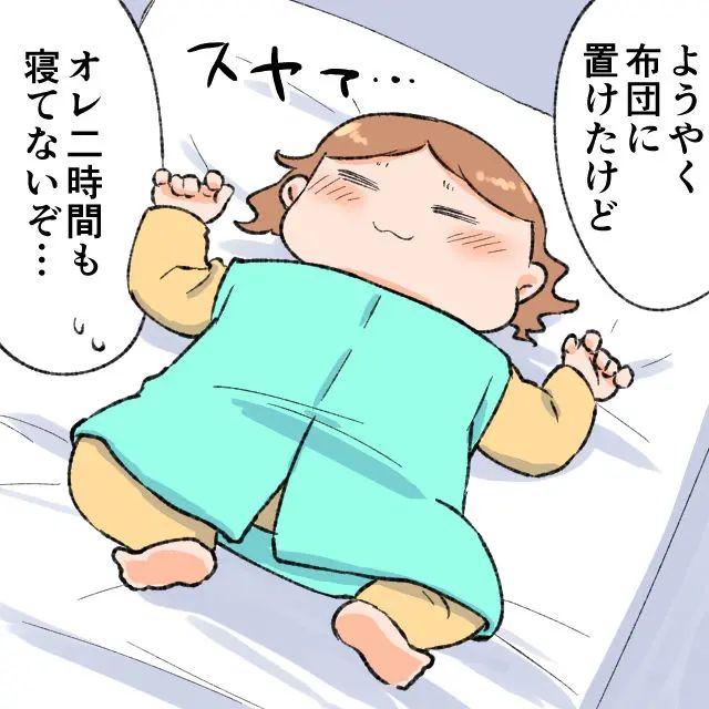 さくらを見ると、ぐっすり眠っている様子。今ならいけるかもと思いそっと布団に置き・・・ようやく正真正銘、寝かしつけに成功しました。しかし俺の体力は限界寸前。「ようやく布団に置けたけど、俺2時間も寝てないぞ・・・」鏡を見なくても、目の下にしっかりとクマが刻まれているのが分かります。