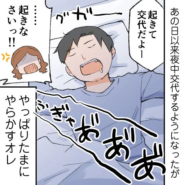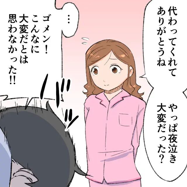 ゆきのは疲れ切った俺を見て察したのか、「代わってくれてありがとうね・・・やっぱ夜泣き大変だった?」と聞いてきました。俺は勢いよく頭を下げると「ゴメン!こんなに大変だとは思わなかった!」とゆきのに謝ります。
