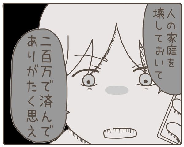 電話の相手は妻の裏切り相手でした。バッチリ証拠もあるというのに、“ただの元上司”だなんてよくも言えますよね。さらには家庭を壊しておいて、慰謝料200万を高いとごねるとは…本当に遊びだったんだなと感じます。