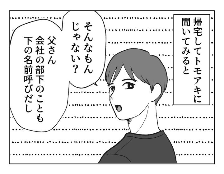 出たーー! 義実家問題で悩む妻に繰り出される、夫の「気にしない」。気にしているから相談しているのに、それに対して「気にしない」はないでしょ~トモアキさん。しかも義父が嫁をよびすてにするなんて、気にしない方が無神経な気もするのですが……。部下と同じに扱われても困るし、その考え方がそもそも問題なのではと突っ込みたくなってしまいますね。