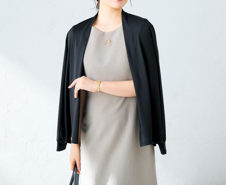 春から秋まで長く活用できるカーディガン。ビジネスにもカジュアルにも、シーンを選ばず活躍してくれそう。ポリエステル100%。長袖キンセキカット®トッパーカーディガン 4389円/AOKI