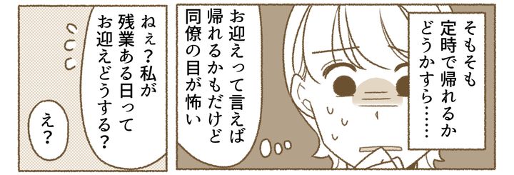 うちの会社は定時が決まっていますが、定時きっちりで帰れることはほぼありません。「保育園のお迎えが」と言えば帰らせてくれるとは思いますが……同僚の冷たい目が頭をよぎります。そういえば私の職場で働いている女性は、独身か、子どもは大きいという方ばかりです。