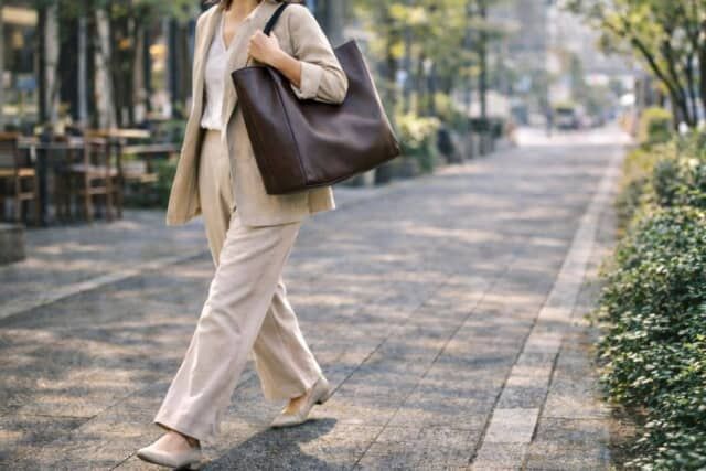 大きめバッグは視覚的な重さが出る分、コーデの重心を下げてくれる役割も。結果として、落ち着いた印象やまとまり感につながります。