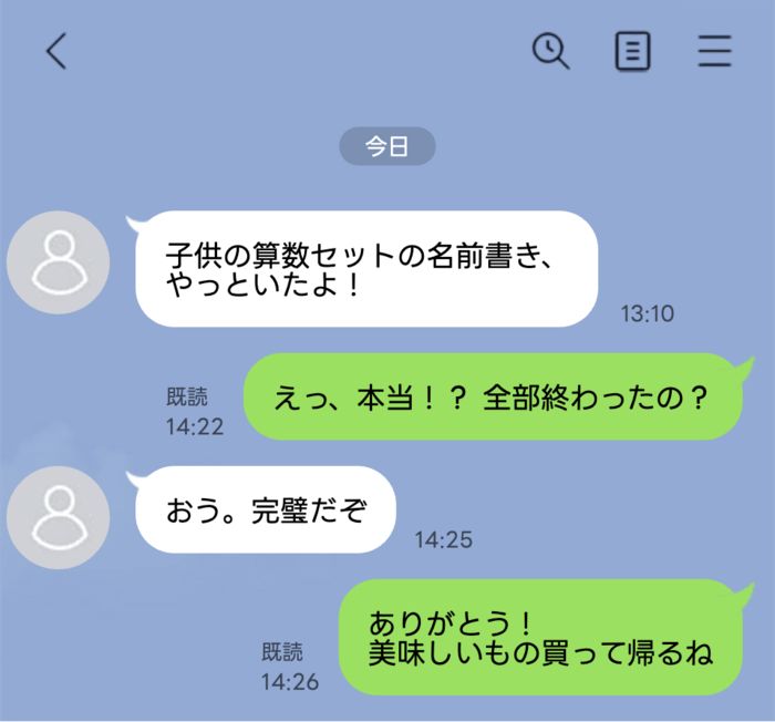 3. 「子供の算数セットの名前書き、やっといたよ!」と夫から優しいメッセージ。だが、帰宅して見てみると、思わず苦笑い