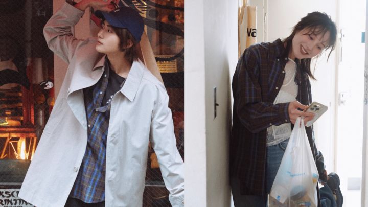 〈左・髙橋大翔のコーデ〉チェックシャツは着回し。 ベージュロングコート 22,000円、黒Tシャツ 4,400円、デニムパンツ 15,400円/以上リーバイス® (リーバイ・ストラウス ジャパン)キャップ 5,500円/カンゴール(kangol headwear)モカシンシューズ 20,900円/ソレル(コロンビアスポーツウェアジャパン)〈右・本田紗来のコーデ〉スエットトップス 9,790円/チャンピオン(ヘインズブランズ ジャパン)白フーディレースワンピース21,780円/être loin ヘアクリップ 1,430円、イヤリング 2,420円/ともにアネモネ(サンポークリエイト)だてメガネ 48,400円/EYEVAN(EYEVAN TokyoGallery)バッグ 9,469円/mucu and ebony(HANA KOREA)ドットバレエシューズ 5,990円/ZARA(ザラ)
