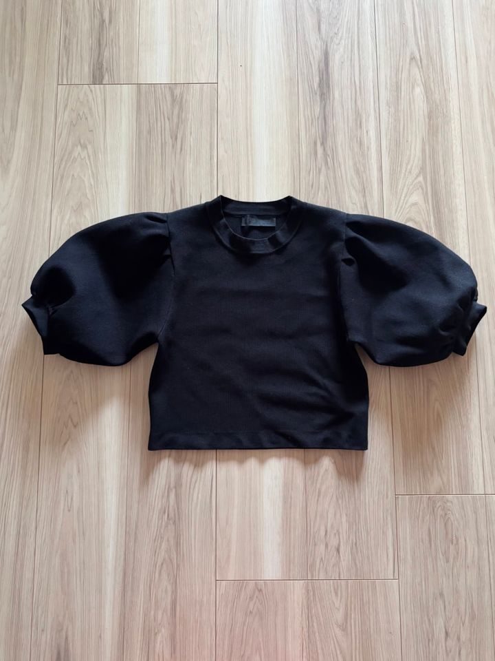 ボリュームたっぷりの袖がポイントのニットトップス。ニットといっても春夏用で、ポリエステル45%、レーヨン32%、ナイロン23%でサラッとした着心地です。ショート丈で、今っぽいバランスで着られるところも◎。最近は同じ黒でも、シンプルなTシャツより、ちょっと何かあるトップスの方を手に取る傾向に。アクセサリーなどを足さずとも盛れるし、デニムやスラックス合わせのワンツーコーデもサマになりやすい! キレイめな印象にもふれるので、シーン選ばず活躍しそう。