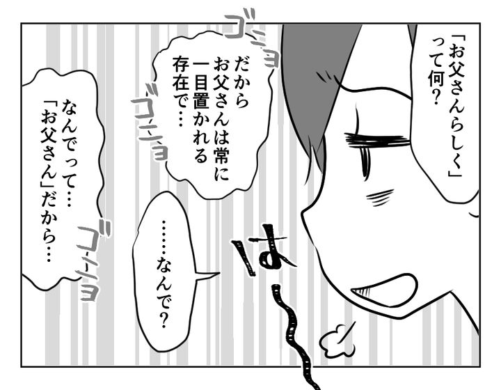 ユカさん……こんなことで怒らないといけないだなんて……気の毒すぎます。ユカさんの「なんで?」に対して、バカのひとつ覚えみたいに「お父さんだから」を繰り返すマサトさん。きっとマサトさん自身も「なんで」が分かっていないのでしょうね。まさに刷り込み教育……洗脳されてきた末路がここにあります。マサトさん、その「なんで」に答えられるようになれば、自分のしていることの愚かさが少しは見えてくると思いますよ?