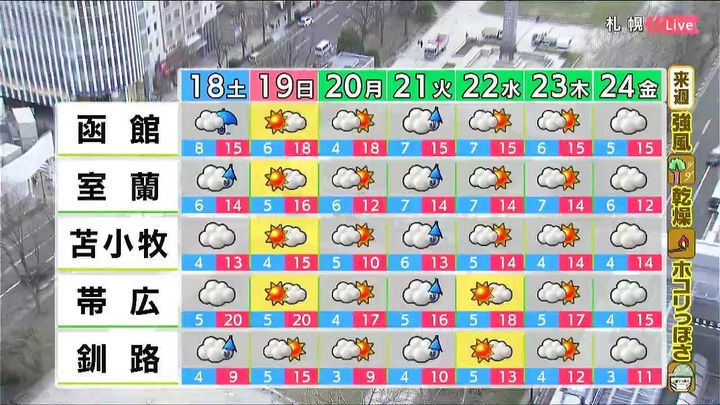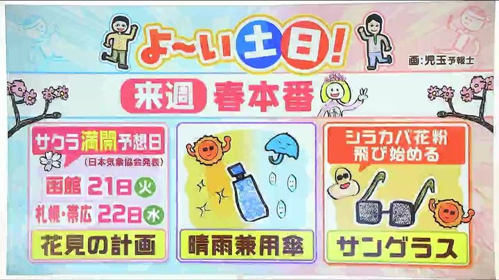 函館は来週火曜日、札幌や帯広は水曜日なので、「花見の計画」は早めに立てましょう。この時期、紫外線が強まってきています。また短い周期で天気も変わるため、「晴れ雨兼用の傘」を準備しましょう。