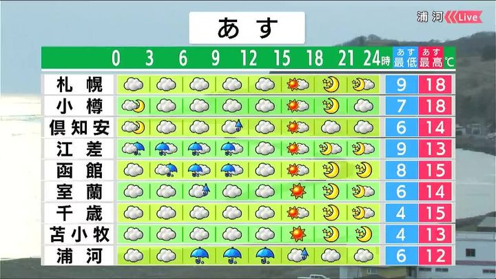 あす18日(土)の時間ごとの天気。道央・道南からです。