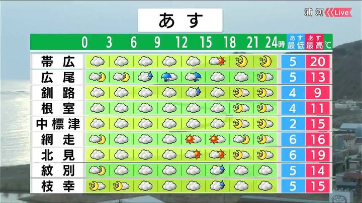 広尾は雨が降りやすく、午後は釧路や紋別、枝幸など所々でにわか雨がありそうです。最高気温は帯広で20度ですが、釧路は9度とヒンヤリします。
