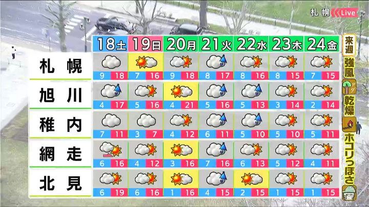 日曜と月曜は日が差しますが、春霞の空になるでしょう。(月曜の旭川は21度と汗ばむ陽気です。)来週は強風や乾燥、空気のホコリっぽさに気を付けて下さい。