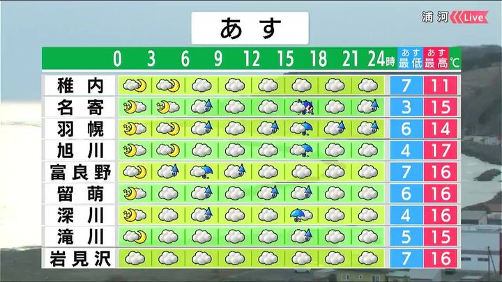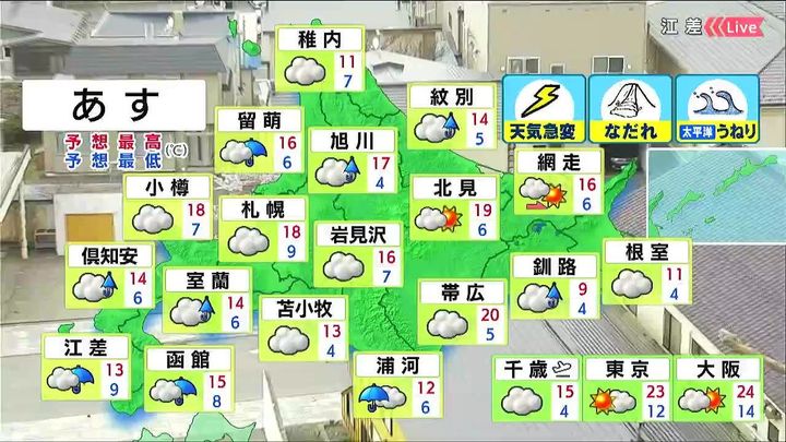 日中はところどころで雨が降り、午後は名寄など内陸を中心に雷雨になるおそれがあります。天気の急変に注意して下さい。