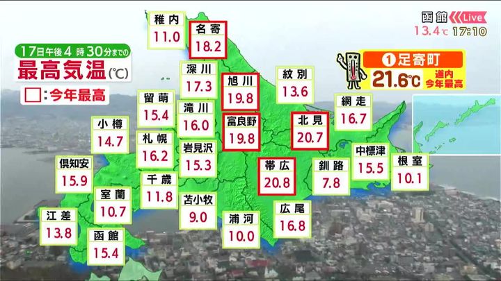午後4時半までの最高気温は、最も高くなった十勝北部の足寄町で、道内今年最高となる21.6度でした。赤枠の旭川や北見、帯広など内陸では今年一番の暖かさになり、北見は今年初めて20度を超えました。