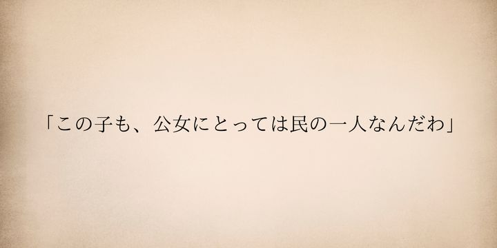 [『小公女』(角川文庫)P194]無一文となったセーラが、極限の飢えの中、拾った銀貨で買ったパンを、より困窮した物乞いの少女へ分け与える場面でつぶやく言葉。自身も貧困状態にありながら、「公女なら民を救うべき」と自らを律し、利他の精神を優先する。 Hearst Owned