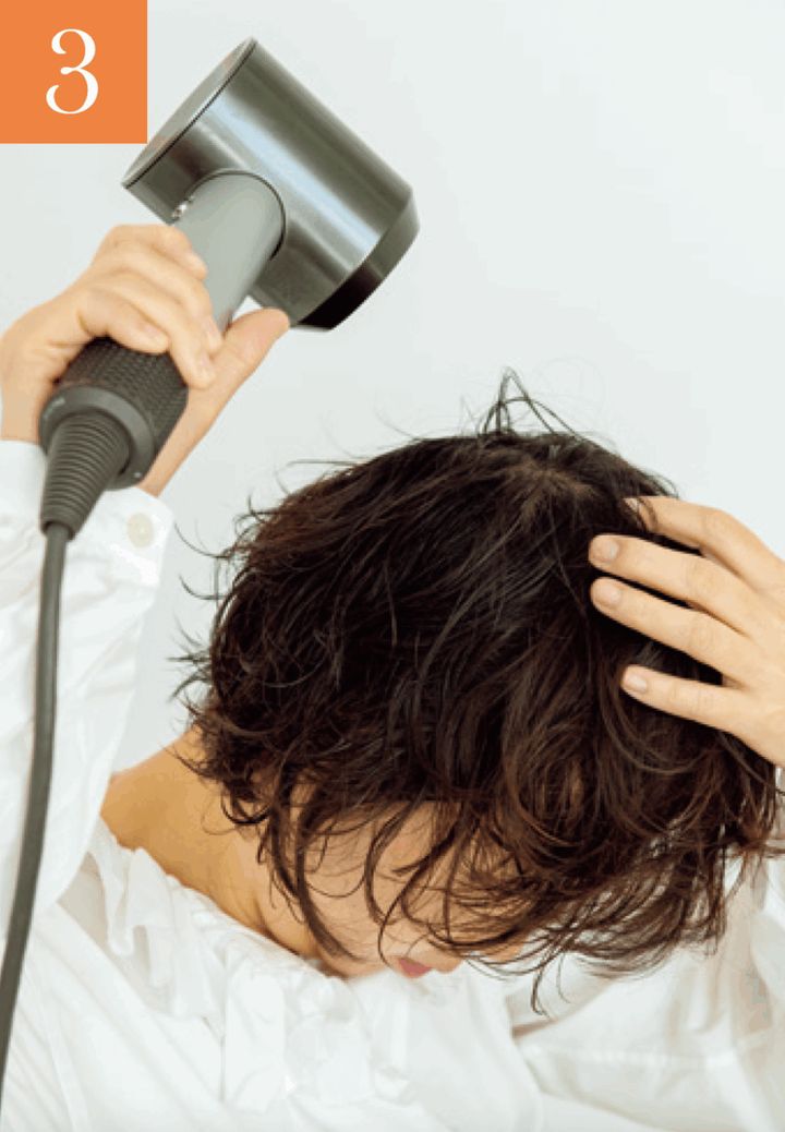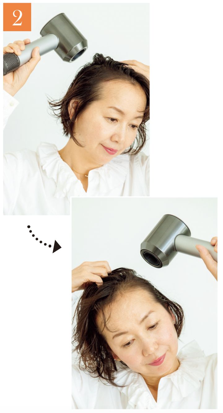 髪のボリュームを出すにはドライヤーのあて方も重要。「乾かし方次第で根元の立ち上がりが変わり、つむじや前髪の割れ目もカバーできます。