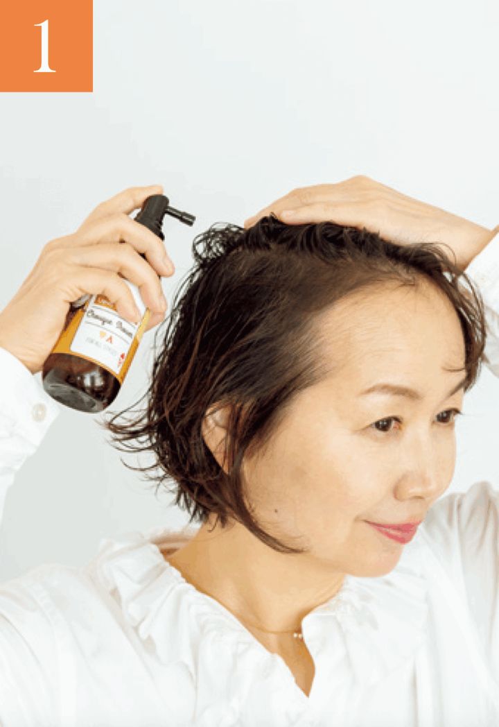 カールセット用のスタイリング剤を根元からまんべんなくスプレー。