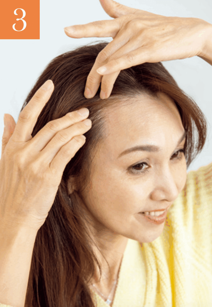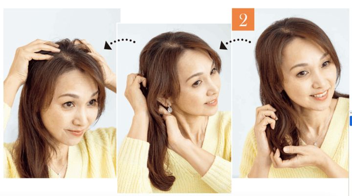 普段の分け目が右側なら、左側に分け目をつくって左から右にドライヤーをあてる。次に、右側はもとの分け目より外に分け目をつくり右から左に乾かす。