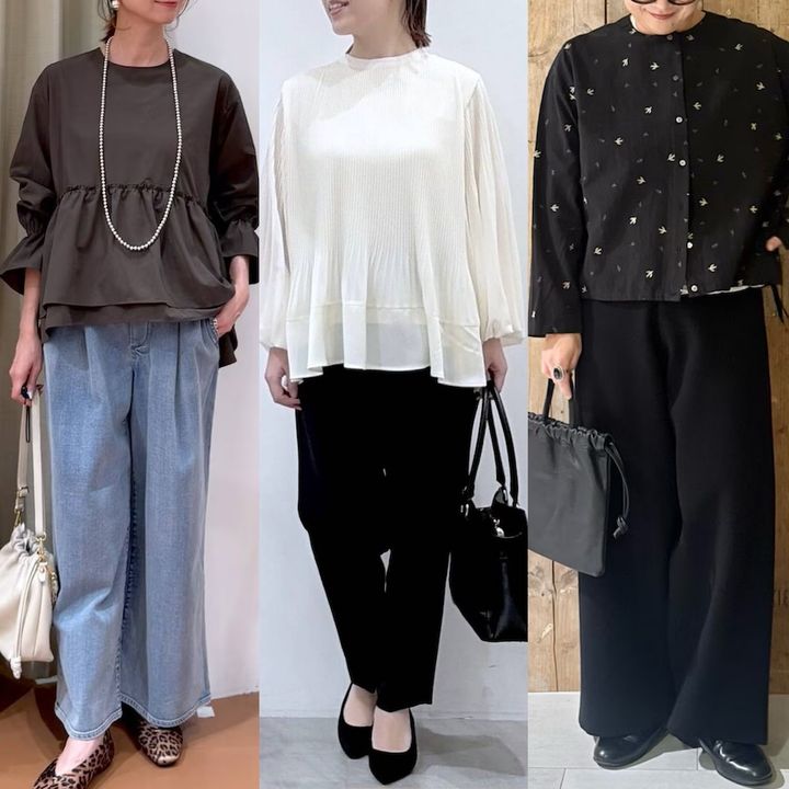 そんなときは、ひとひねりあるデザイン性の高いブラウスを選ぶと抜け感が出て、人とも被りにくい着こなしに。