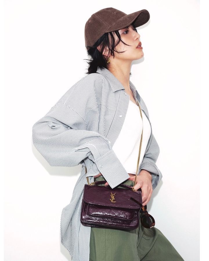 4月18日(土)、ゆるいストライプシャツに白タンク、カジュアルなカーキパンツと、ラフに傾きがちなリラックス感のあるコーデ。ですが、ボルドーのバッグをひとつ効かせるだけで印象がぐっと引き締まります。深みのある色味でエレガントさを添え、女っぽさをさりげなくプラスして。カジュアルコーデも、小物の印象を変えるだけで、上品に昇華できます。
