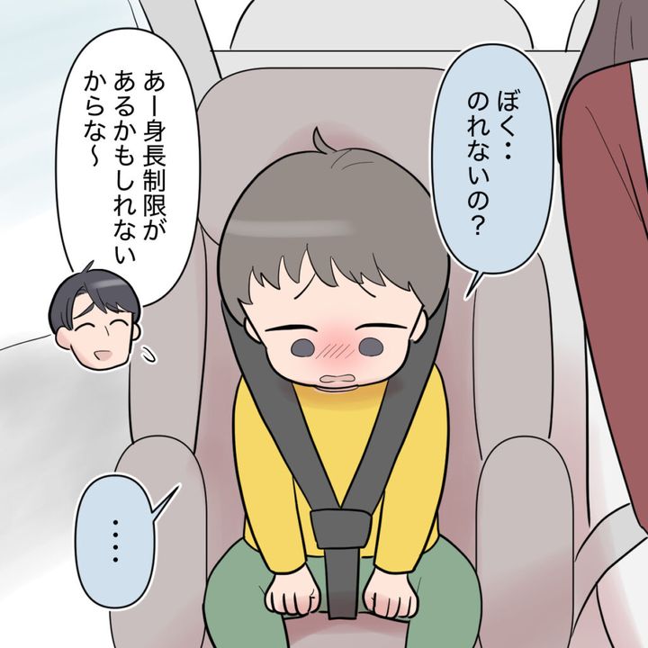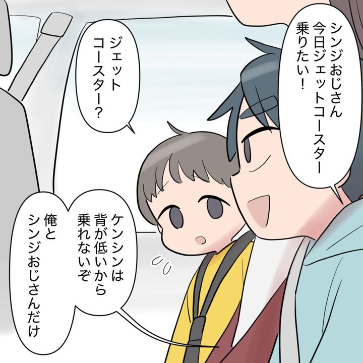 するとタイガ君が「シンジおじさん、今日ジェットコースター乗りたい!」とシンジに声をかけます。それを聞いたケンシンが「ジェットコースター?」と首をかしげると、タイガ君は「ケンシンは背が低いから乗れないぞ?俺とおじさんだけ」と、ケンシンをさりげなく仲間外れにしました。