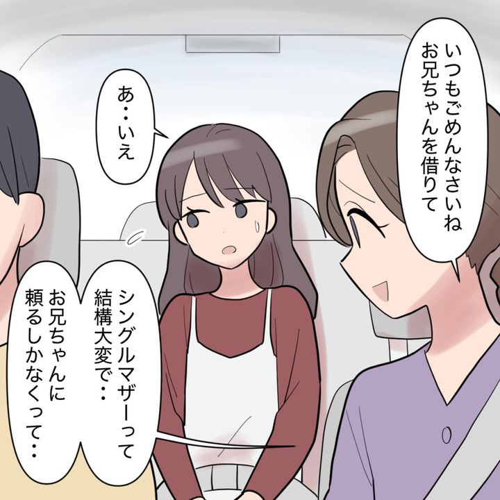 車に乗り込むと、カオルさんが助手席からこちらを振り向き「いつもごめんなさいね、お兄ちゃんを借りて・・・シングルマザーって結構大変でお兄ちゃんに頼るしかなくって」と申し訳なさそうに言いました。私は何だか気まずくなって「あ・・・いえ」と思わず視線をそらします。