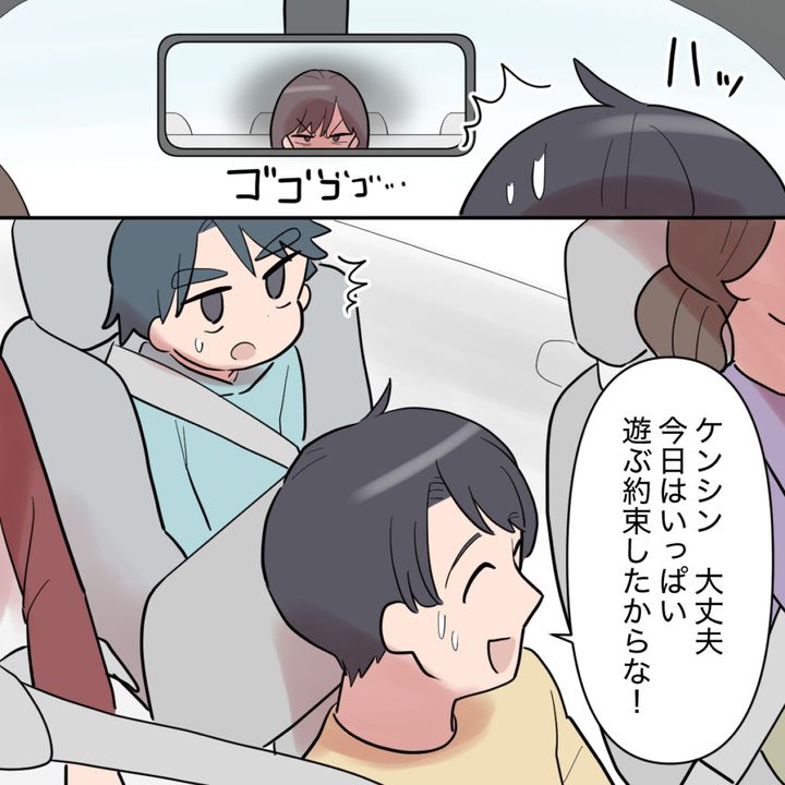 私たちを騙して連れてきたうえに、ケンシンまで仲間外れにするつもり?私はルームミラー越しに、シンジを鋭い目つきでにらみつけました。それに気づいたシンジはハッとして「ケンシン大丈夫!今日はいっぱい遊ぶ約束したからな!」と慌ててケンシンをフォローします。