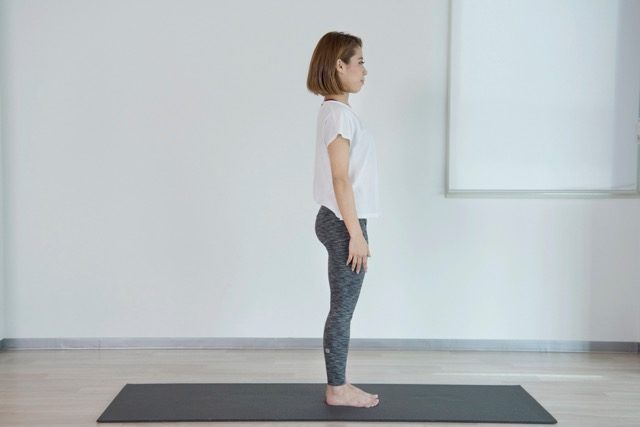 両脚を揃えて立ち、つま先は正面へ。骨盤を立て、頭のてっぺんが引き上がるイメージで背筋を伸ばします。まずは“縦の軸”を整えることがスタートです。