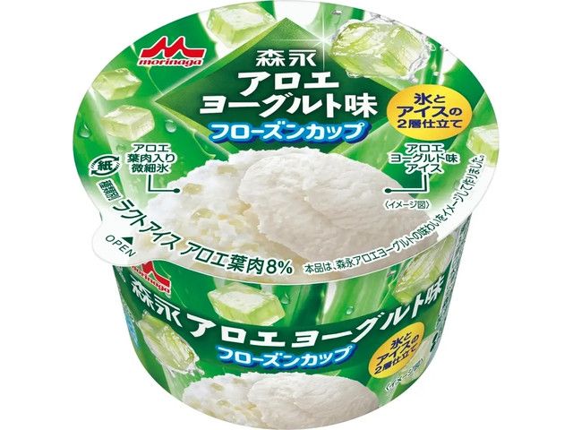 ①アロエ葉肉入りの微細氷とアロエヨーグルト味アイスが楽しめる2層仕立てのカップアイスです。 ➁冷凍下でも固くなりにくいアロエ葉肉を8%使用しています。 ③ロングセラーブランド「森永アロエヨーグルト」をイメージした爽やかなパッケージデザインです。