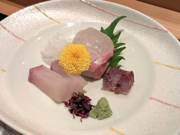 お造りの「鯛とかんぱち」は、鮮度が際立つ一皿です。天丼によく合う「赤出汁」と「香物」とともに、おいしくいただきました。