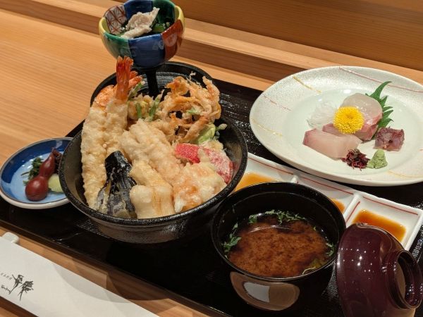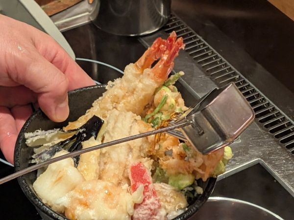 ショーのようなライブ感を五感で味わいつつ、料理人とお話ししながらいただくのも、この天婦羅カウンターでいただく醍醐味です。仕込みの話や季節の食材の話なども聞けて、理解が深まる分、おいしさも一段上がるんですよね。 素材の旨みを引き立て、揚げたてを熱々のまま丼に仕上げる「海の恵み天丼」をいただきながら、素敵な春のひと時を過ごしてみてはいかがでしょうか。