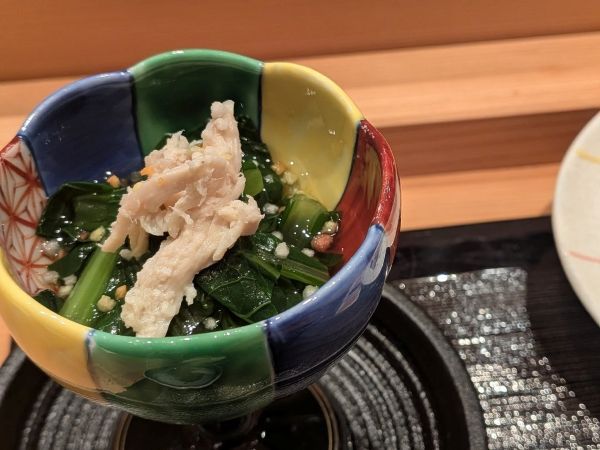 天丼の前にいただくお料理も、また格別です。「小松菜のお浸し」は上品な出汁がほっとする味わい。