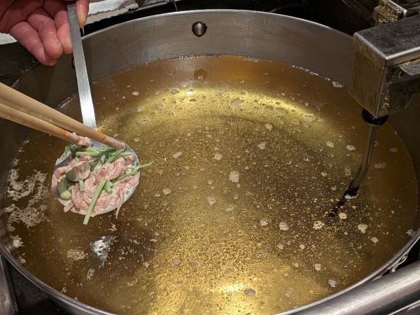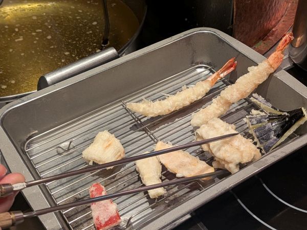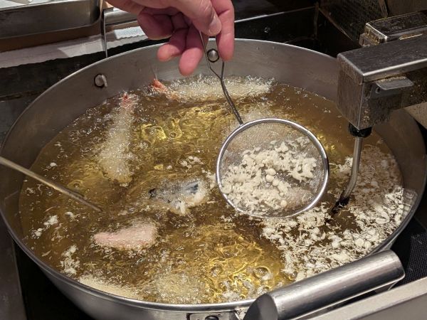 粉は水分を飛ばすために寝かせ、油は白絞油・ごま油・菜種油を配合するなど、おいしい天婦羅を揚げるためのこだわりが沢山あるそうです。透明感のある油は美しく、浮いた衣は白くて輝いて見えるほど。