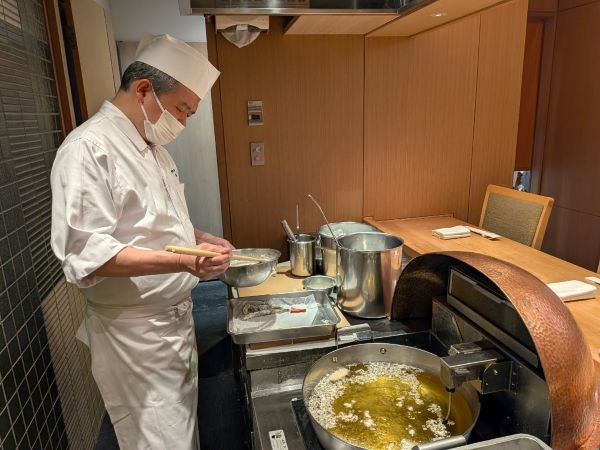 今回天婦羅を揚げてくださったのは、優しい笑顔がすてきな副料理長の稲垣さんです。 「目の前のカウンターで油の香りも感じていただけるのは、オープンキッチンならではの醍醐味です。敷居が高いと思われがちな天婦羅ですが、ホテルのランチで4500円でいただくことができますので、一度是非味わっていただきたいです。必ず満足していただけるはずです。」と話してくださいました。