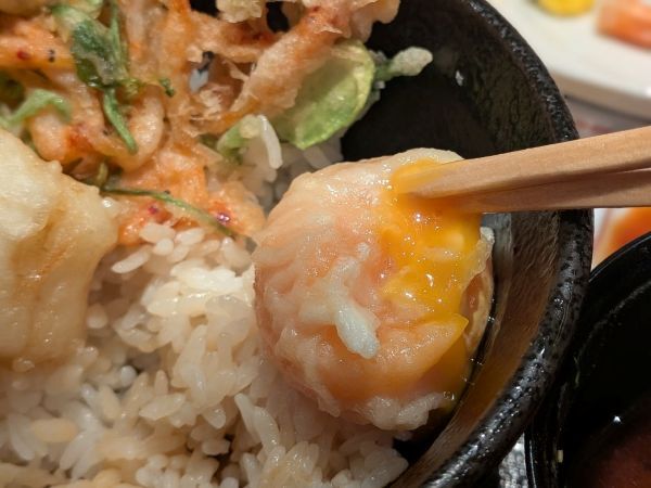 卵黄は、絶妙な火入れの賜物!他の具材と絡めて食べるのも乙なものでしたよ。旬の筍やかき揚げなど、揚げることによって素材の旨味が引き出された一つ一つが、どれも印象に残る天丼でした。