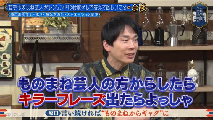この話に、かまいたち・濱家隆一は「そういうキラーフレーズ出たら、よっしゃ!やもんね」と納得した様子。原口は「使い続けるっていうのは一個ある」と、繰り返すことが「真似」から「芸」へとつながるポイントの一つだと語った。