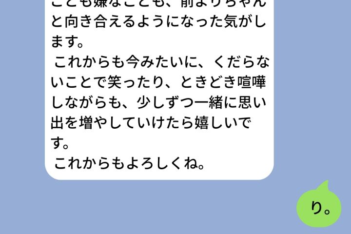 あの日から、彼女のメッセージにはできるだけ同じくらいの長さで返すようにしています。正直、長文を打つのは得意じゃない。でも、あの夜味わった「り」の冷たさを思い出すと、指が自然と動きます。短い返事の裏にある無関心さを、俺は悪気がないという言葉で片づけていただけでした。伝えてくれる人がいることは、当たり前じゃない。そのことを、たった1文字が教えてくれました。