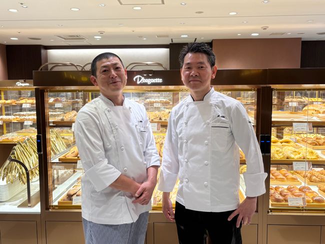 大丸梅田店のバイヤーからラブコールを受けた、「ブーランジュリー パリゴ」のオーナシェフ、安倍竜三さん(写真下右)が、「ダイヤ」の製造部長の仲西功次さん(同左)との“共創”を提案。仲西さんは「安定した品質を追求する当社の製法と、安倍シェフの伝統的な製法は、全く異なるため、最初は不安でした」と振り返ります。対して安倍シェフは「いかに小麦のうま味や甘みをパンで表現するかが、パンづくりのテーマ。それに基づいた製法を追求しています。ダイヤさんの技術力の高さを信頼しているので、全く不安はなかったですね」とにっこり。