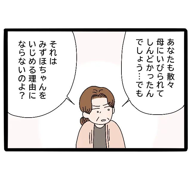 千恵おばちゃんは母のほうを向いて「あなたも散々母にいびられてしんどかったんでしょう・・でも、それはみずほちゃんをいじめる理由にならないのよ?」とたしなめるように言いました。