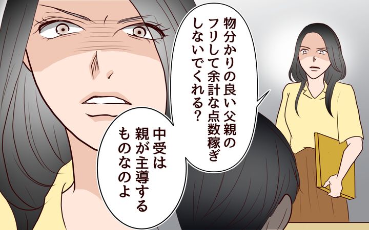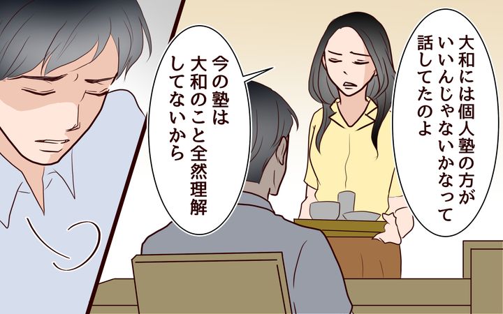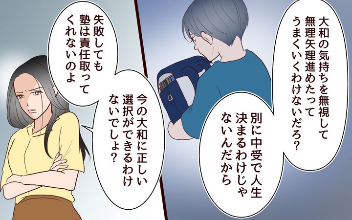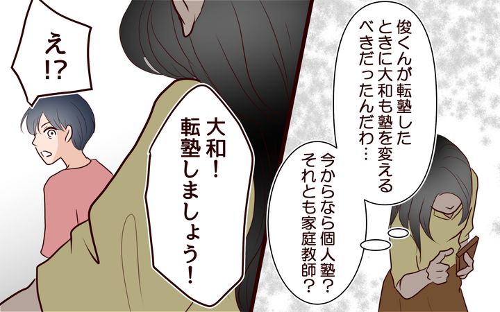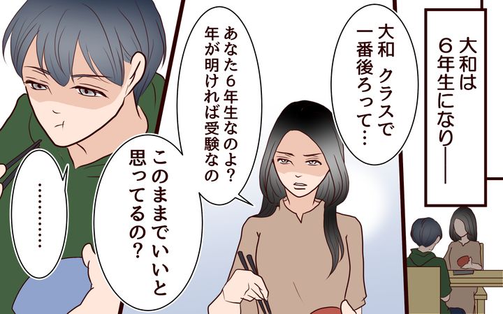 小6になった息子の成績はどんどん落ちていき、私は焦っていました。転塾も考えるけれど、大和が嫌がっていて…。しかも夫は、息子の気持ちを尊重すべきだと主張。いつだって夫は役に立たず、私の邪魔ばかり。息子の気持ちに寄り添って物分かりの良い父親を演じたところで、息子が受験に合格するわけではないのに…。