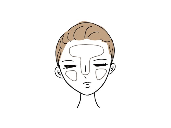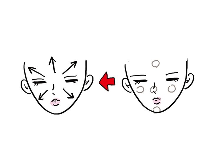 一度に広げるとむらづきの原因に。両ほお・額・鼻・あごの5点に置き、顔の中心から外側へやさしくなじませましょう。点置きすることで、均一に広がり、塗り残しを防げます。
