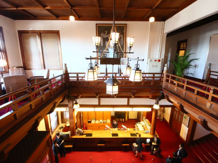 内部には、営業室をはじめ、貴賓室や会議室が配されている。金唐革紙の壁紙や漆喰装飾も良好な状態で残り、明治期の美意識を今に伝えている。さらに、一般客・貴賓客・従業員それぞれの動線を分けた計画も特徴的で、見た目の美しさだけでなく、使いやすさにも配慮された建築であることがうかがえる。