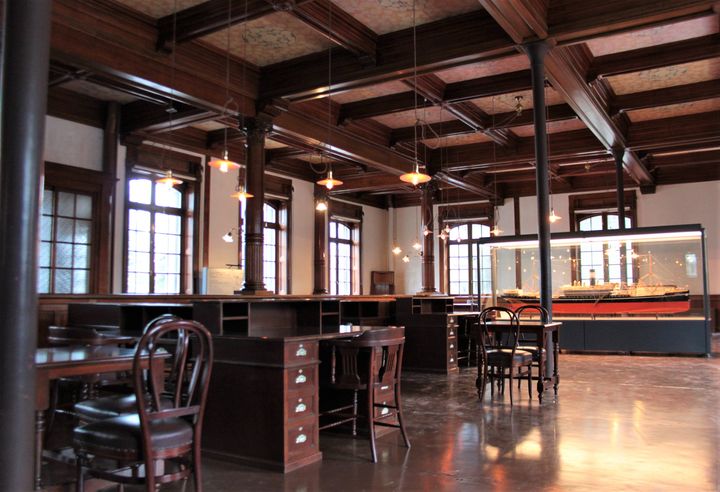 <写真>貨物や旅客の取り扱い業務などが行われた「営業室」。天井は梁による突出を活かした装飾性の高い格子状で、天井高が最大限に確保された開放的な空間。意匠を凝らした柱頭飾りにも注目したい。