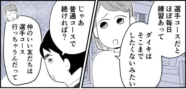 私(エトウカナ、30代)と夫(トモキ、40代)は同郷で、小4の息子(ダイキ)が私の母校に通っています。息子は好奇心旺盛で興味のあることはなんでも挑戦したがる子です。一方で飽きっぽいところもあり、唯一続けられている習い事はスイミングだけ。スイミングは幼稚園の頃から続けていて、かなり上達しました。しかし仲のいい子が選手コースに移ったことで、息子のスイミング熱は一気に冷めたようです。最近は野球の試合ばかり観ています。