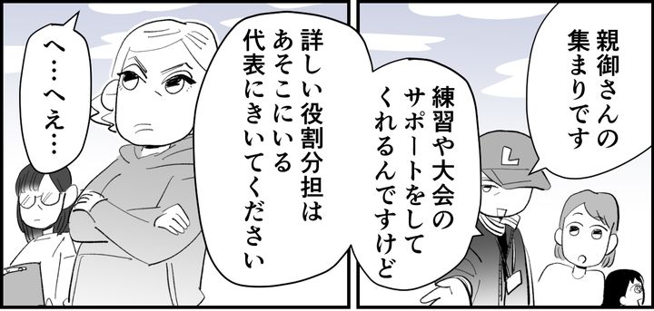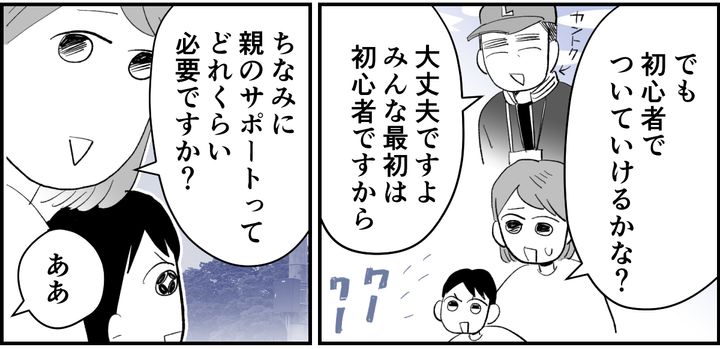 私は監督から「初心者も多い」ときいて安心する一方で、「親会」という親の集まりに不安を抱きます。