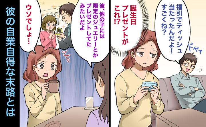 しかし、実際の行動はその言葉とはかけ離れていました。デートは毎回私の部屋で、外出を提案すると「金の無駄」と断られます。誕生日に渡されたのは、「福引でティッシュ当たったんだよ! すごくね?」とドヤ顔で差し出されたポケットティッシュでした。