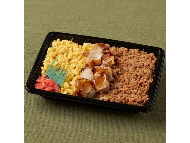 たまごそぼろ、鶏そぼろをのせたご飯に、甘めのタレをかけた鶏から揚げをトッピングした弁当です。 四国で販売