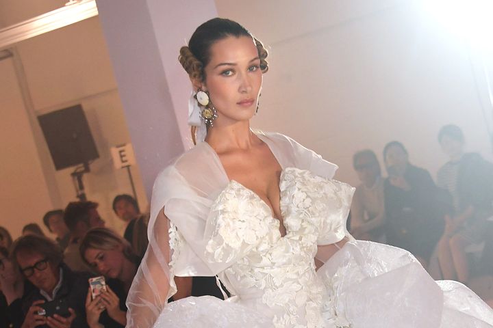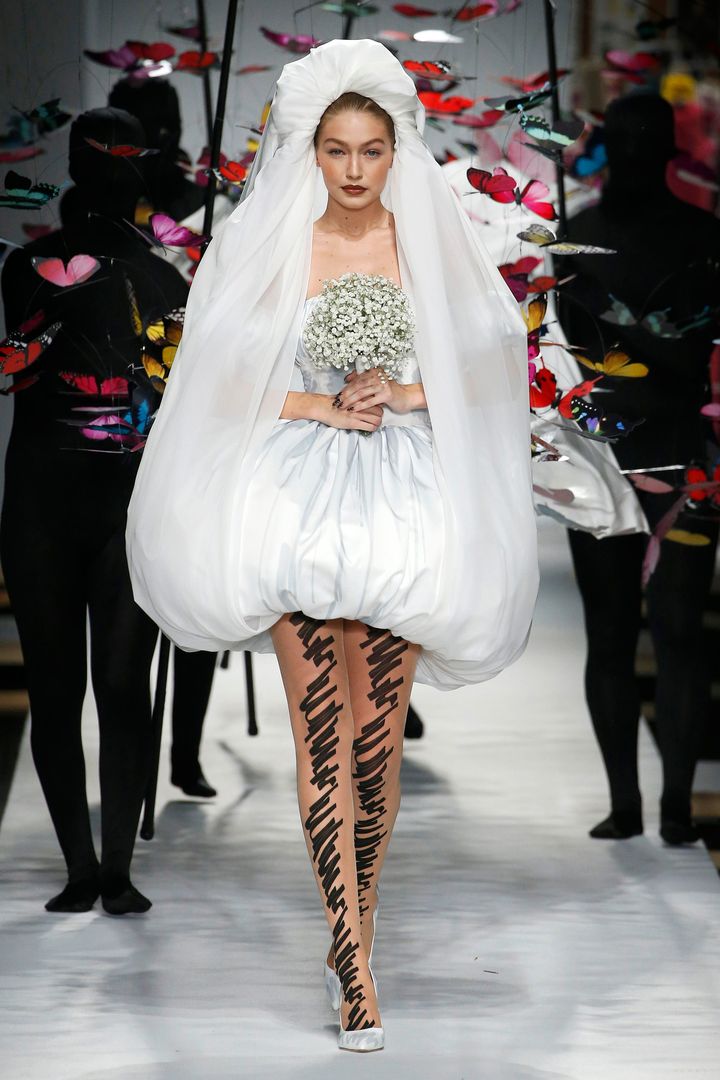 2018年春夏モスキーノのショーでは、デザイナーのジェレミー・スコットらしい遊び心とウィットに富んだウエディング・ドレスをまとって。脚に描かれたマジックの手描き風グラフィック、未完成のデッサンを形にしたようなデザイン、そして長いトレーンには色とりどりの蝶が舞う幻想的な演出と、見どころが満載。世界中のファンに幸福な花嫁姿を想像させる、伝説的なランウェイとなりました。