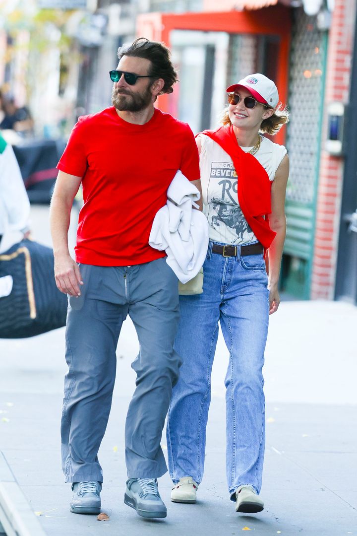 2024年11月、ニューヨークでデート中の様子。ジジはグラフィックTシャツにデニムを合わせた軽快なスタイル。自身のブランド、ゲスト・イン・レジデンスの赤いカシミアカーディガンを肩掛けし、ラグジュアリーなストリート感を演出しています。ブラッドリーも彼女とトーンを合わせた赤いTシャツをチョイス。色をシンクロさせることで、親密かつファッション感度の高いカップルコーデに。